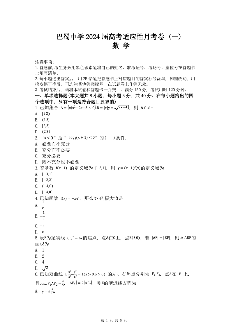 重庆市巴蜀中学2024届高考适应性月考卷(一)数学