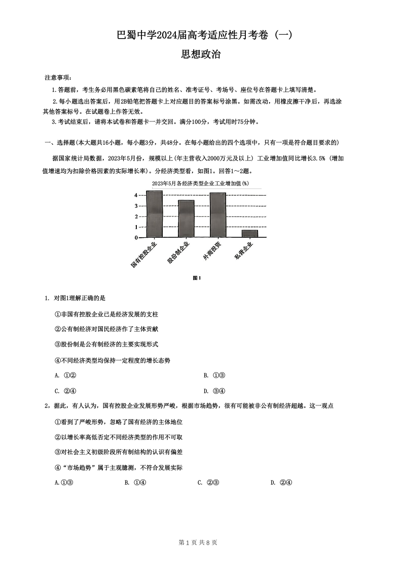 重庆市巴蜀中学2024届高考适应性月考卷(一)政治(原版卷)