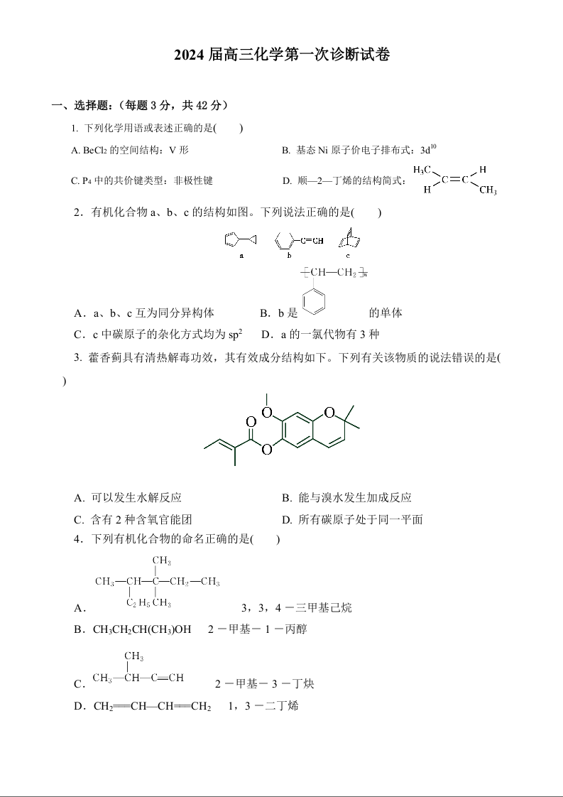 甘肃省武威市凉州区2024届高三上学期第一次诊断考试化学