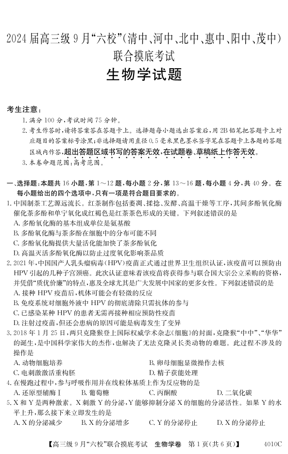 广东省六校(清中、河中、北中、惠中、阳中、茂中)2024届高三9月联考生物