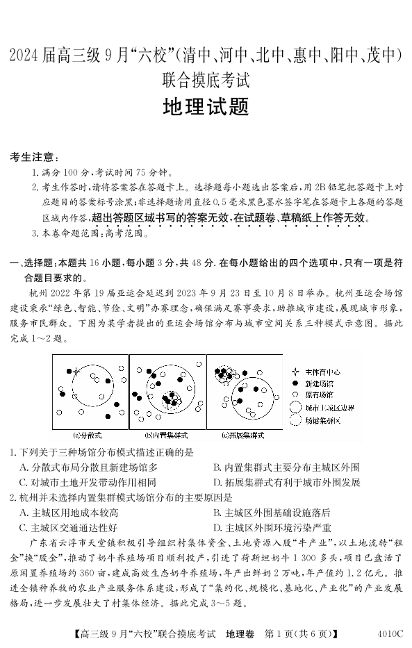 广东省六校(清中、河中、北中、惠中、阳中、茂中)2024届高三9月联考地理