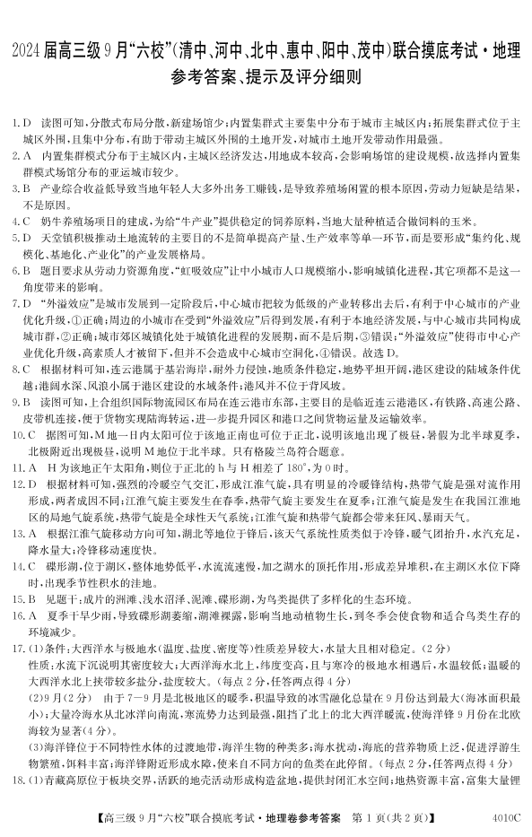 广东省六校(清中、河中、北中、惠中、阳中、茂中)2024届高三9月联考地理答案