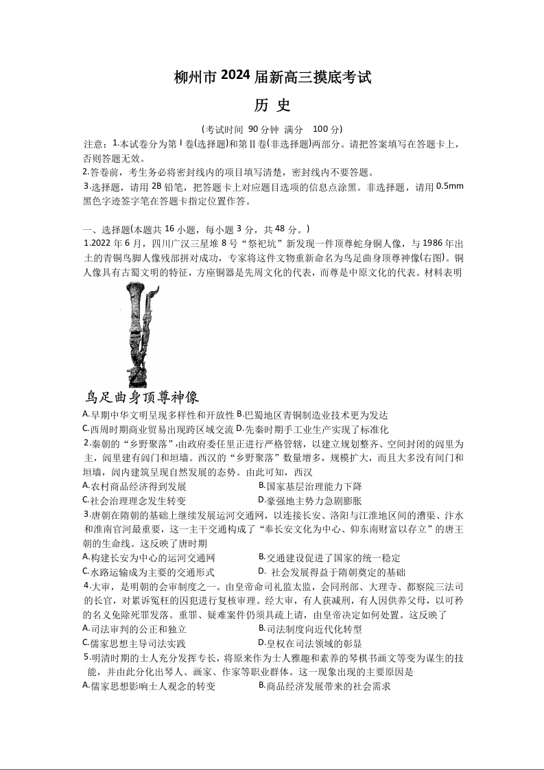 广西省柳州市2024届新高三上学期开学摸底考试历史
