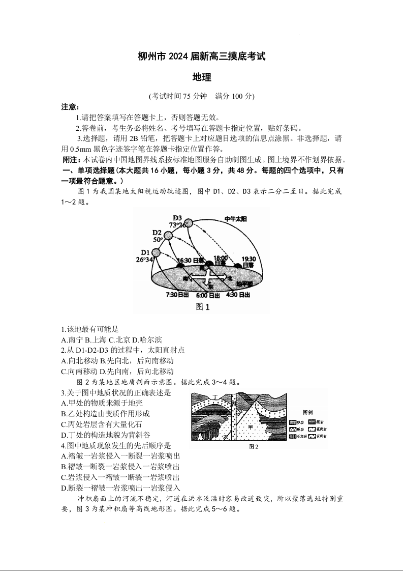 广西省柳州市2024届新高三上学期开学摸底考试地理+答案