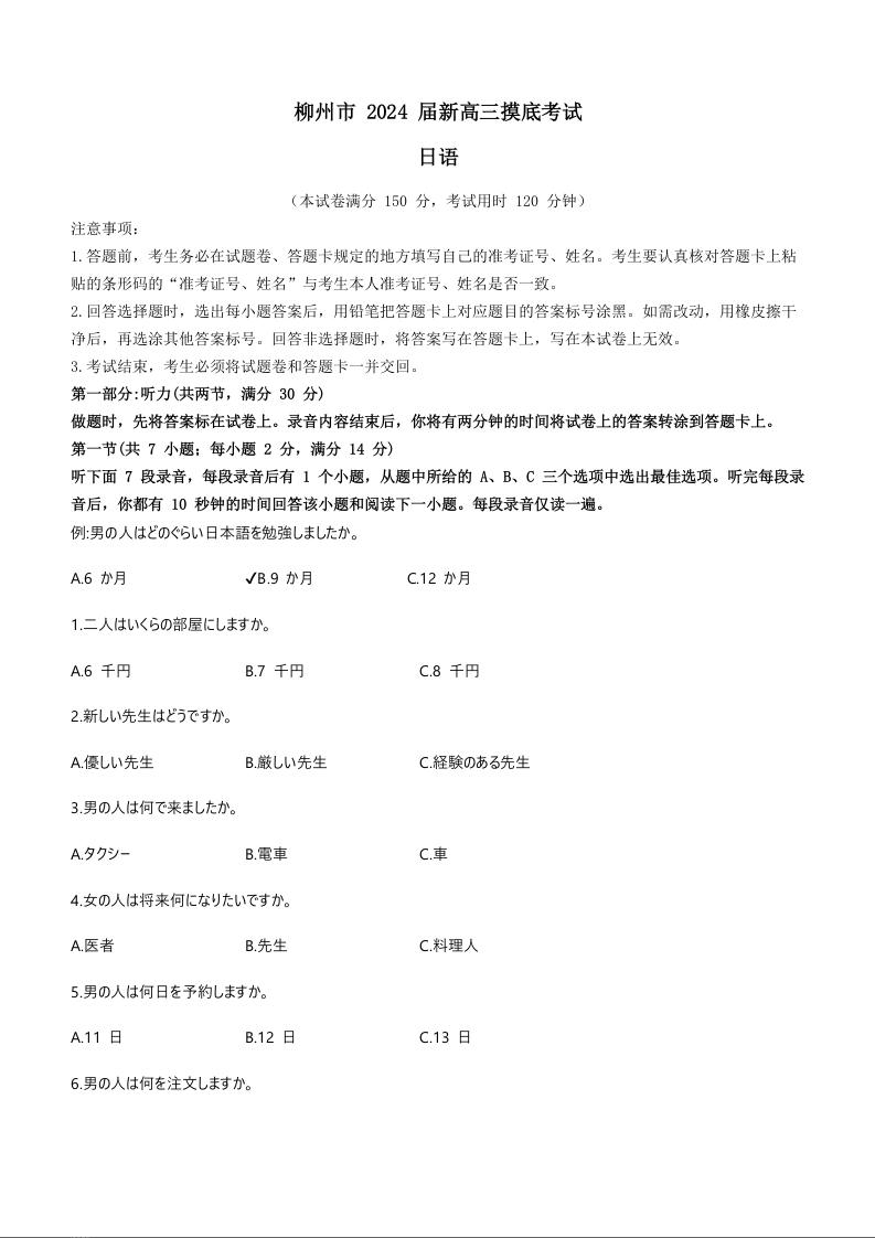广西省柳州市2024届新高三上学期开学摸底考试日语+答案