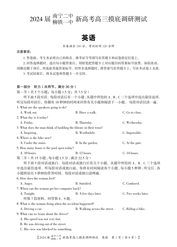 广西省南宁二中柳铁一中2024届新高考高三摸底考试英语