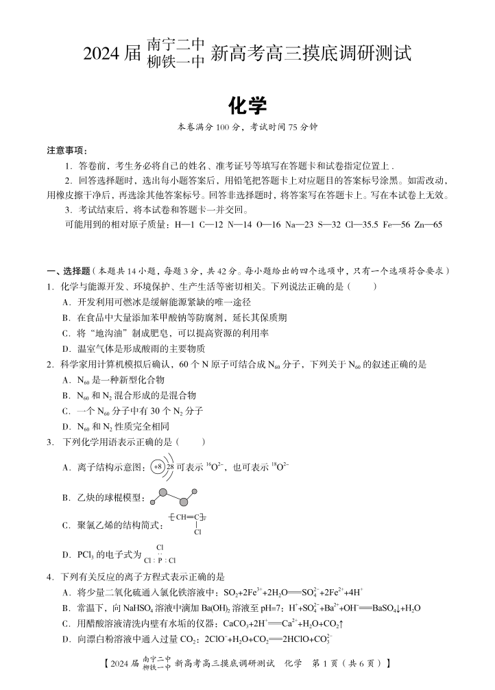 广西省南宁二中柳铁一中2024届新高考高三摸底考试化学