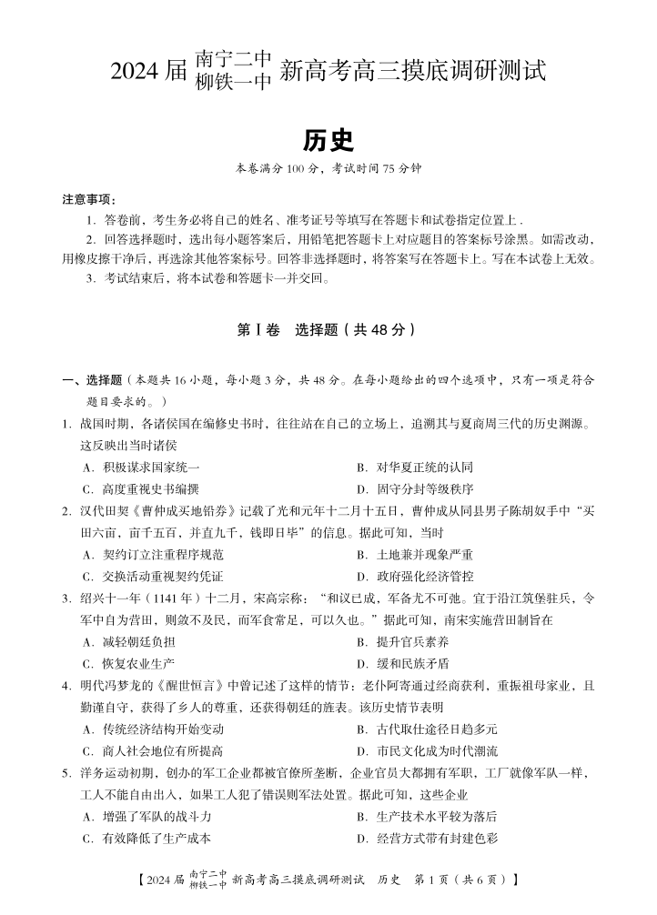 广西省南宁二中柳铁一中2024届新高考高三摸底考试历史