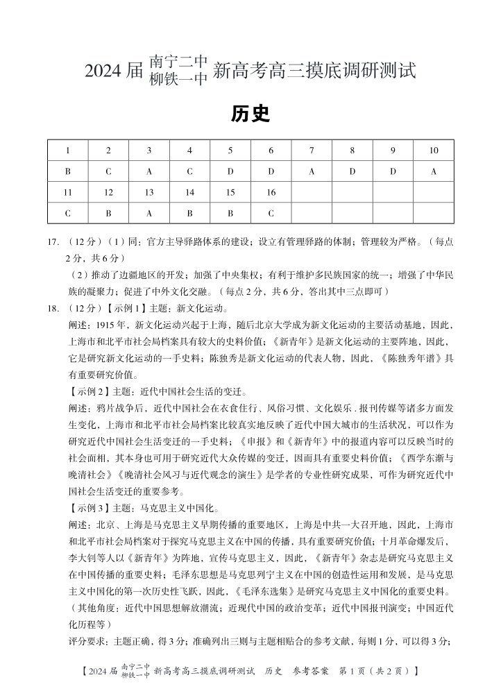 广西省南宁二中柳铁一中2024届新高考高三摸底考试历史答案
