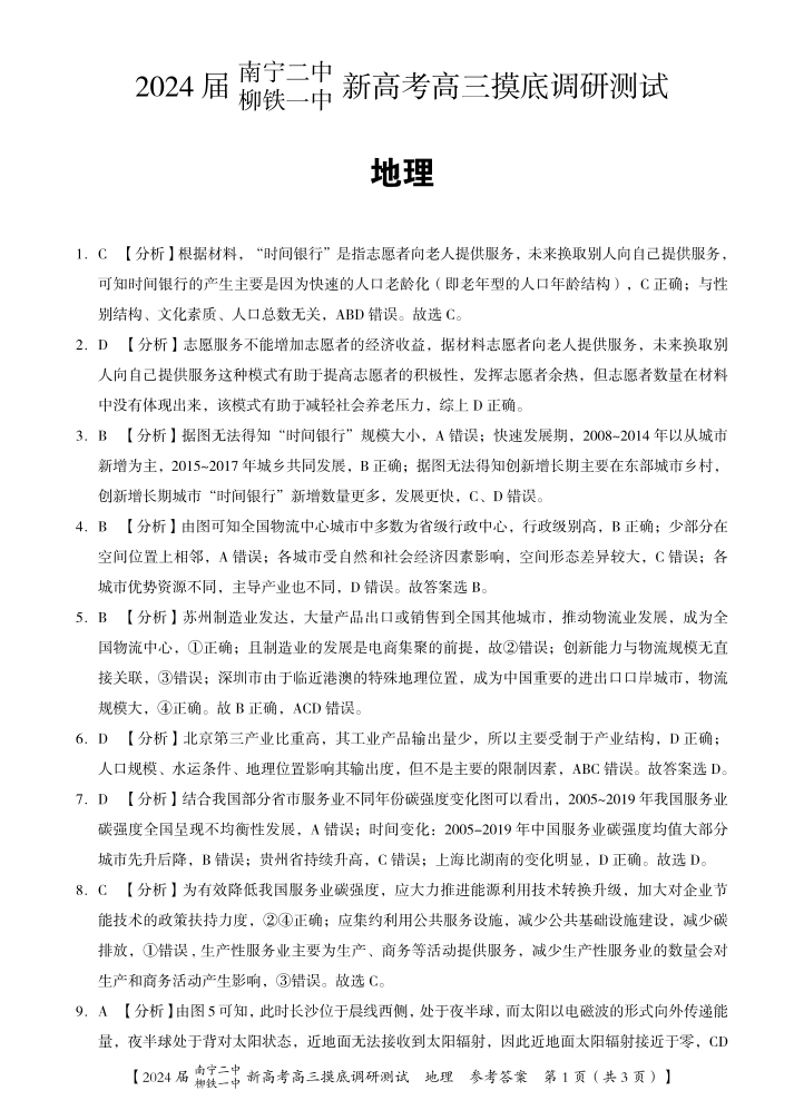 广西省南宁二中柳铁一中2024届新高考高三摸底考试地理答案