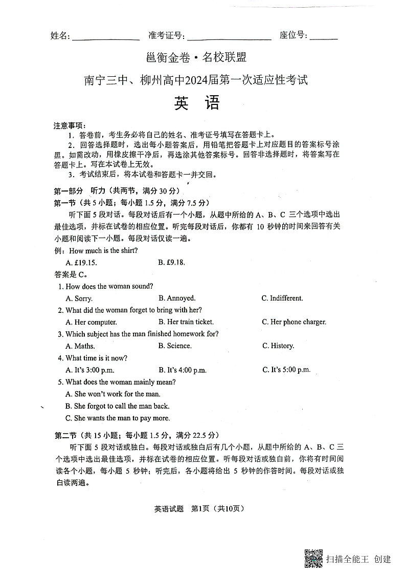 广西省南宁三中柳州高中2024届第一次适应性考试英语