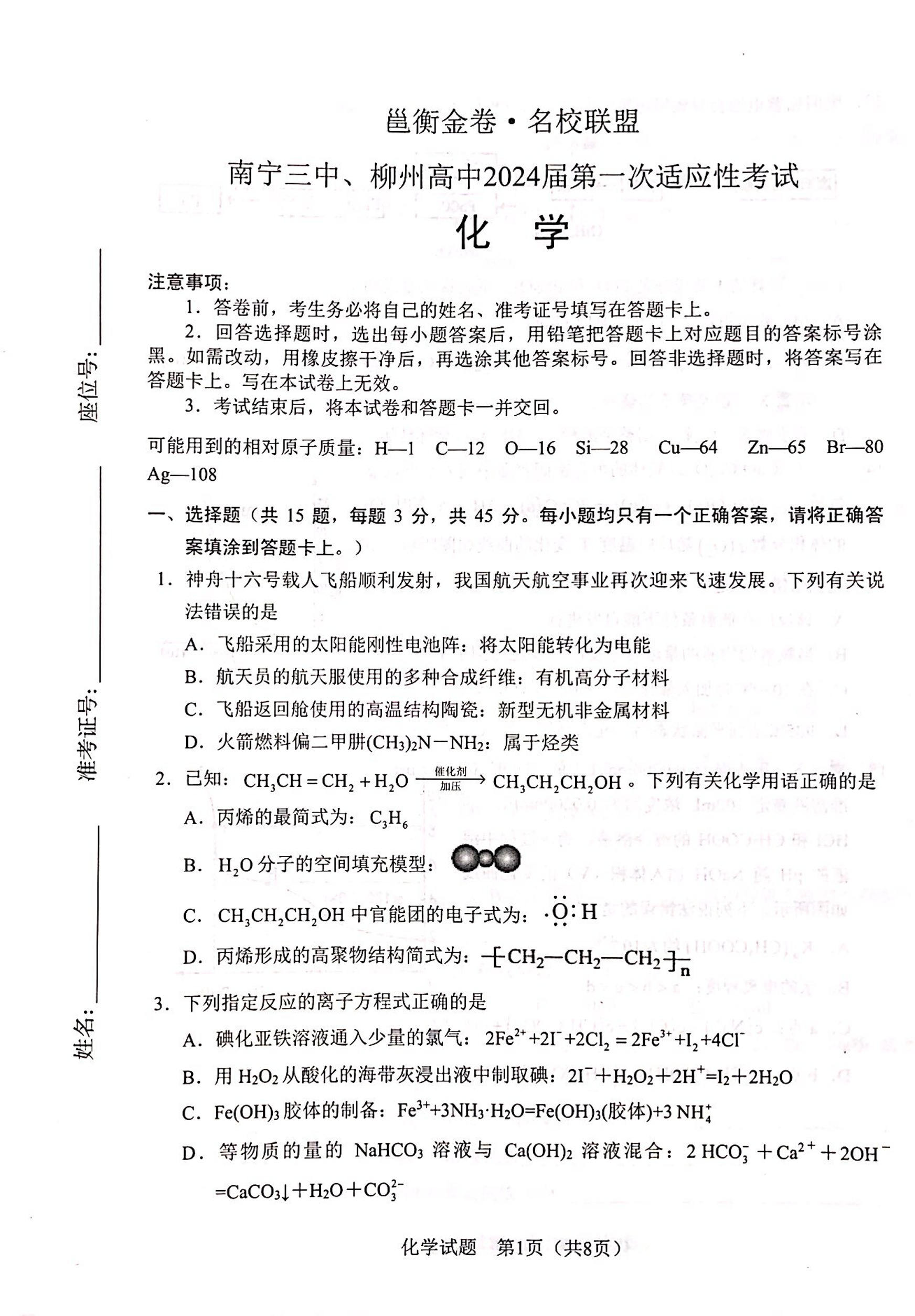 广西省南宁三中柳州高中2024届第一次适应性考试化学