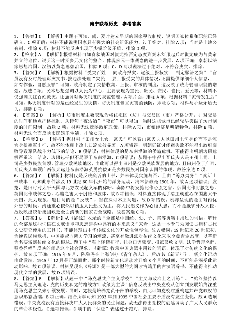 广西省南宁三中柳州高中2024届第一次适应性考试历史答案