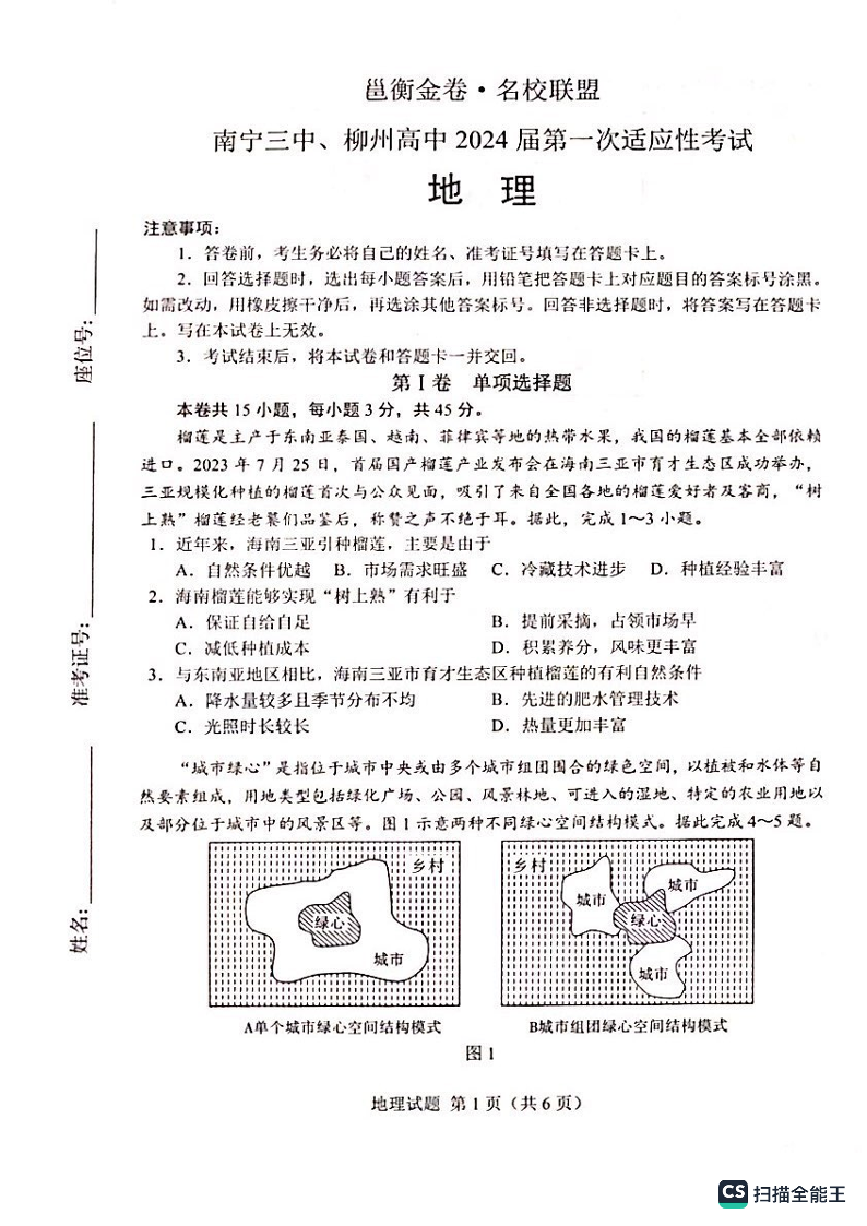 广西省南宁三中柳州高中2024届第一次适应性考试地理