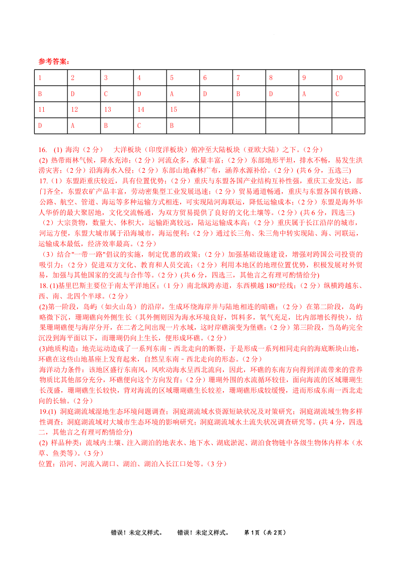 广西省南宁三中柳州高中2024届第一次适应性考试地理答案