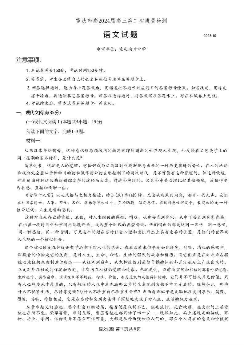 重庆市南开中学高2024届高三质量检测(二)语文