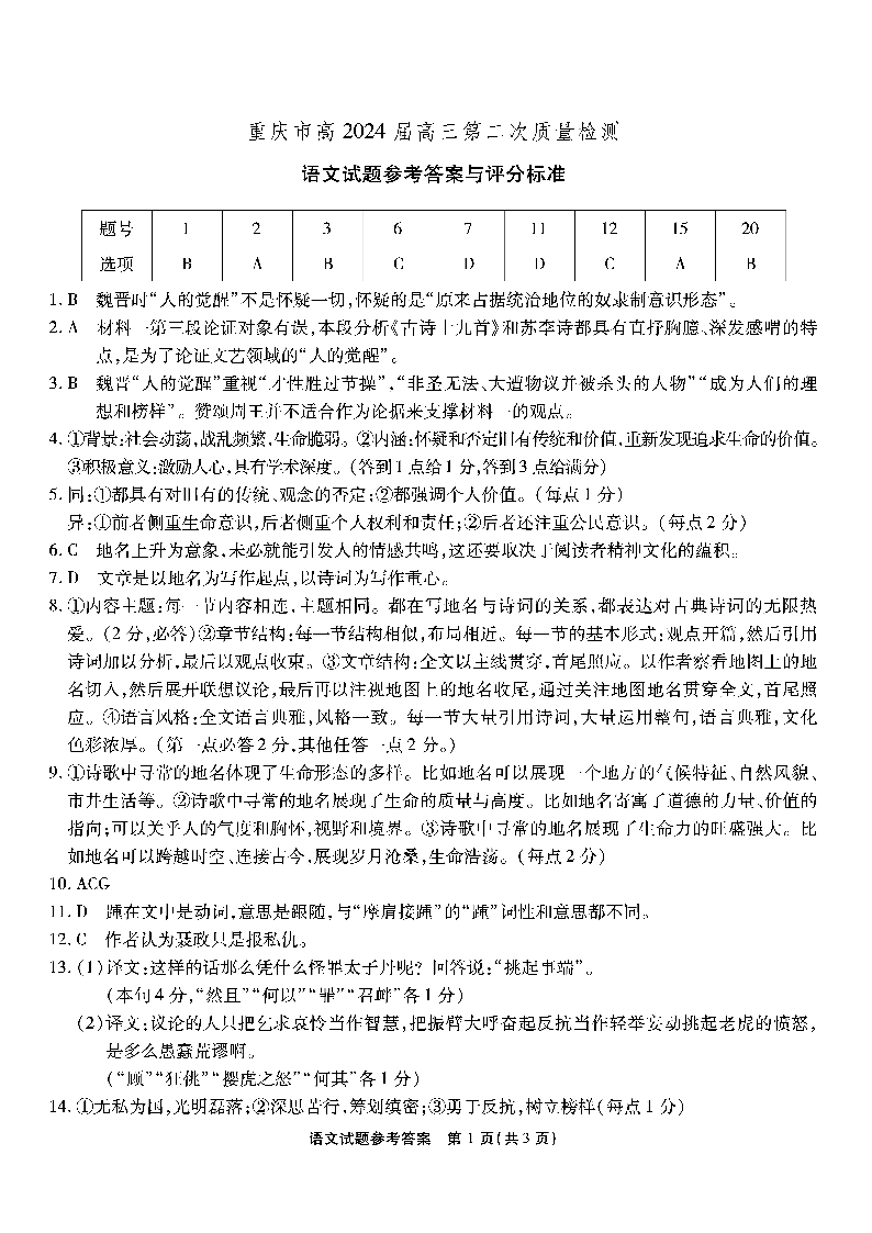 重庆市南开中学高2024届高三质量检测(二)语文答案