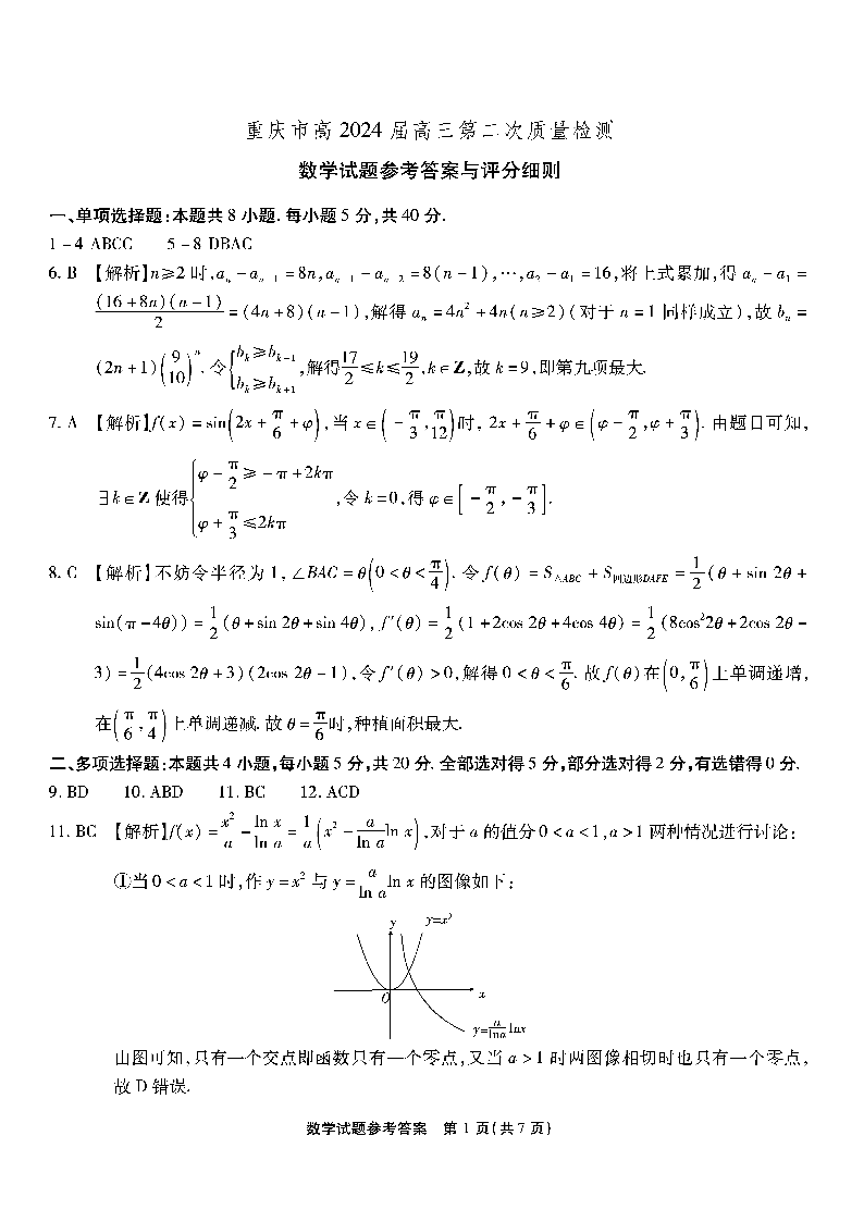 重庆市南开中学高2024届高三质量检测(二)数学答案