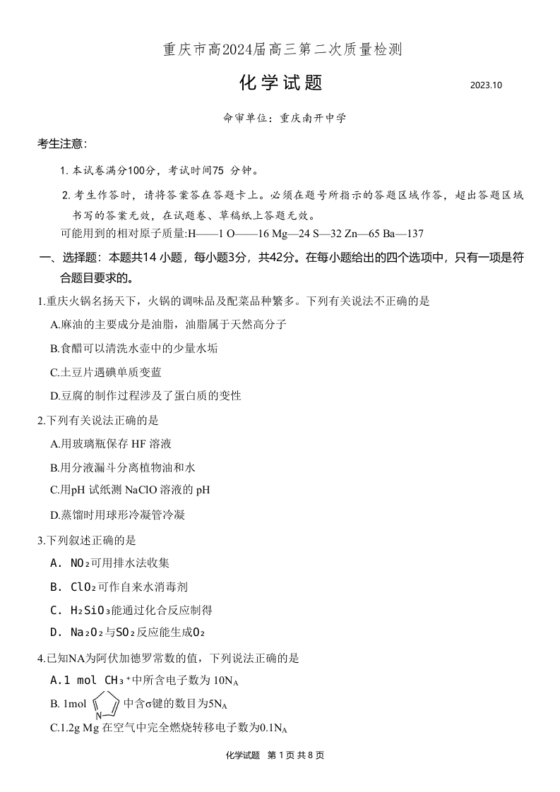 重庆市南开中学高2024届高三质量检测(二)化学