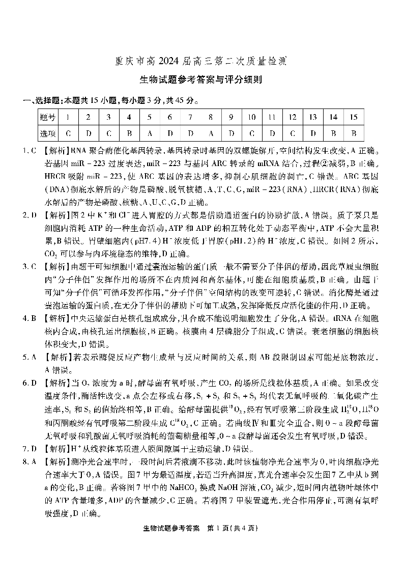 重庆市南开中学高2024届高三质量检测(二)生物答案