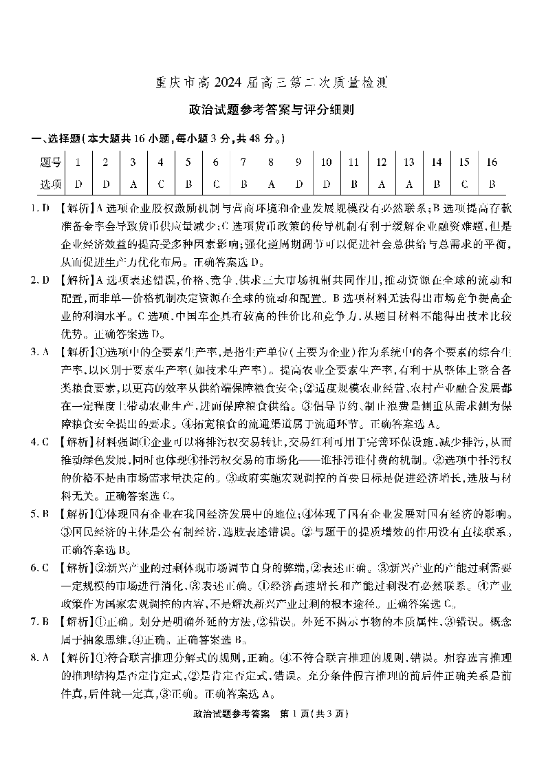 重庆市南开中学高2024届高三质量检测(二)政治答案