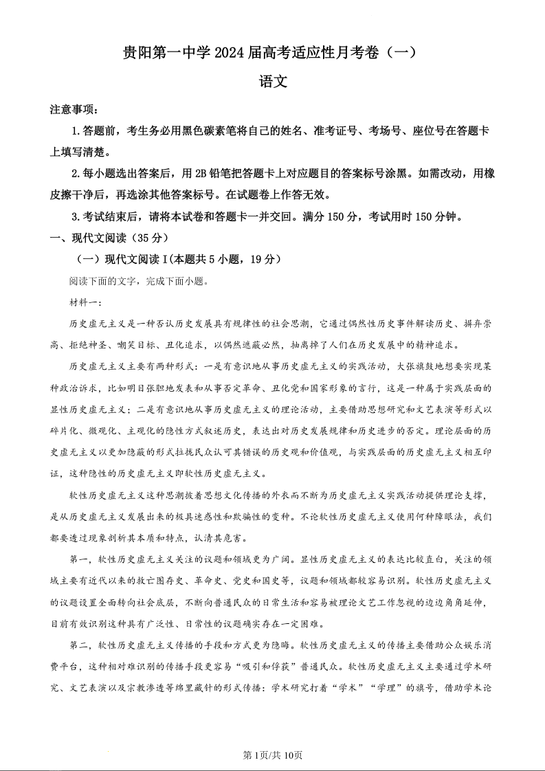 贵州省贵阳市第一中学2024届高考适应性月考(一)语文(原卷版)