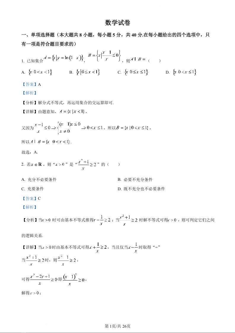贵州省贵阳市第一中学2024届高考适应性月考(一)数学(精品解析版)