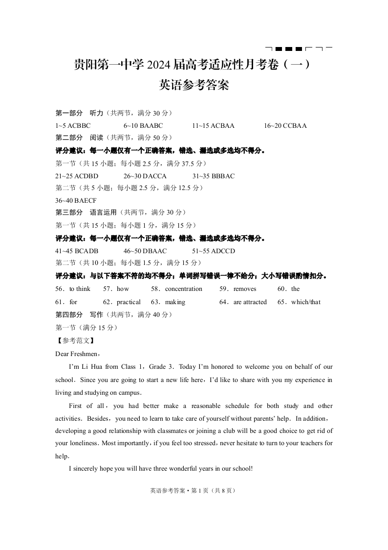 贵州省贵阳市第一中学2024届高考适应性月考(一)英语答案