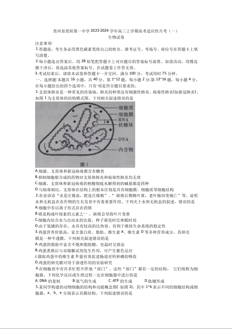 贵州省贵阳市第一中学2024届高考适应性月考(一)生物