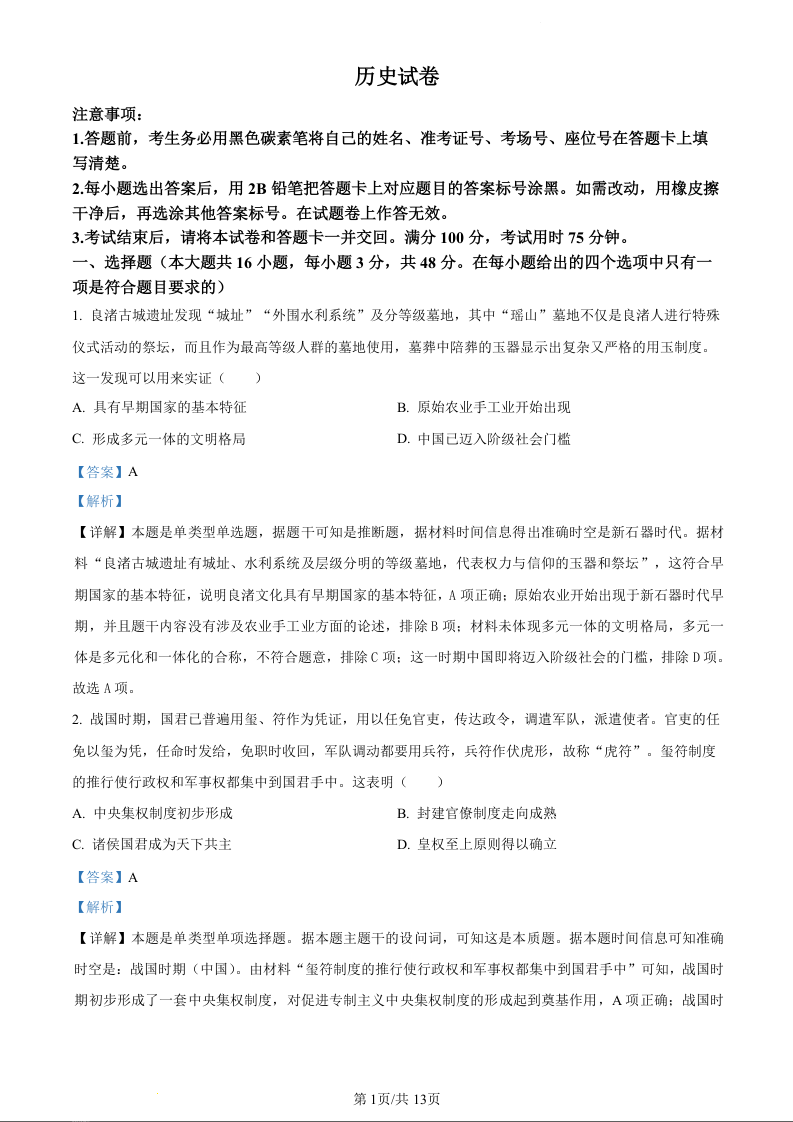 贵州省贵阳市第一中学2024届高考适应性月考(一)历史(精品解析版)