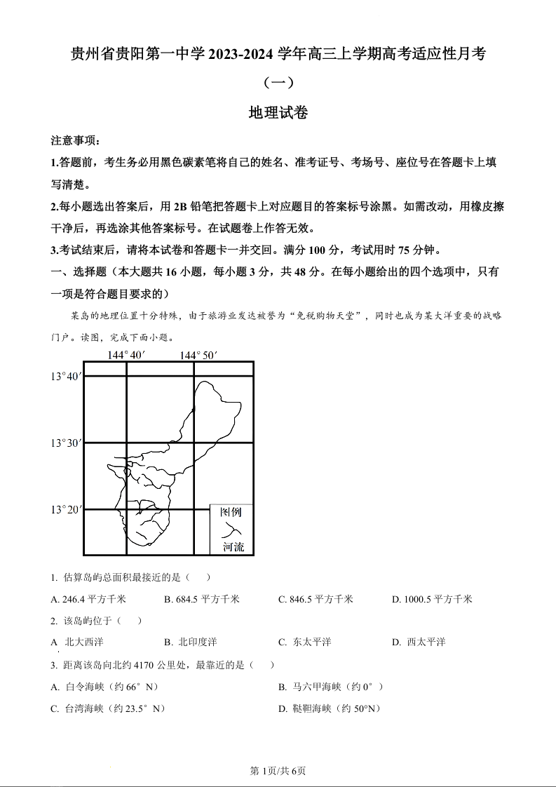 贵州省贵阳市第一中学2024届高考适应性月考(一)地理(原卷版)