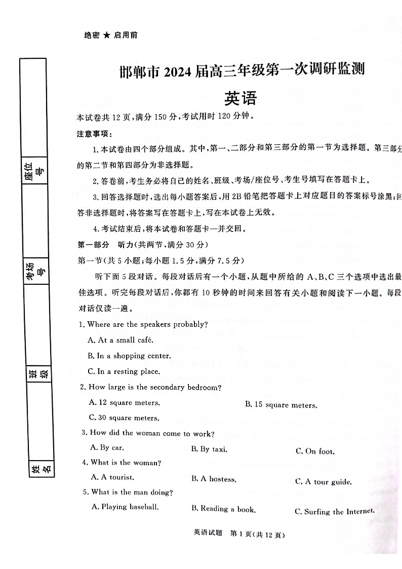 河北省邯郸市2024届高三上学期第一次调研监测英语