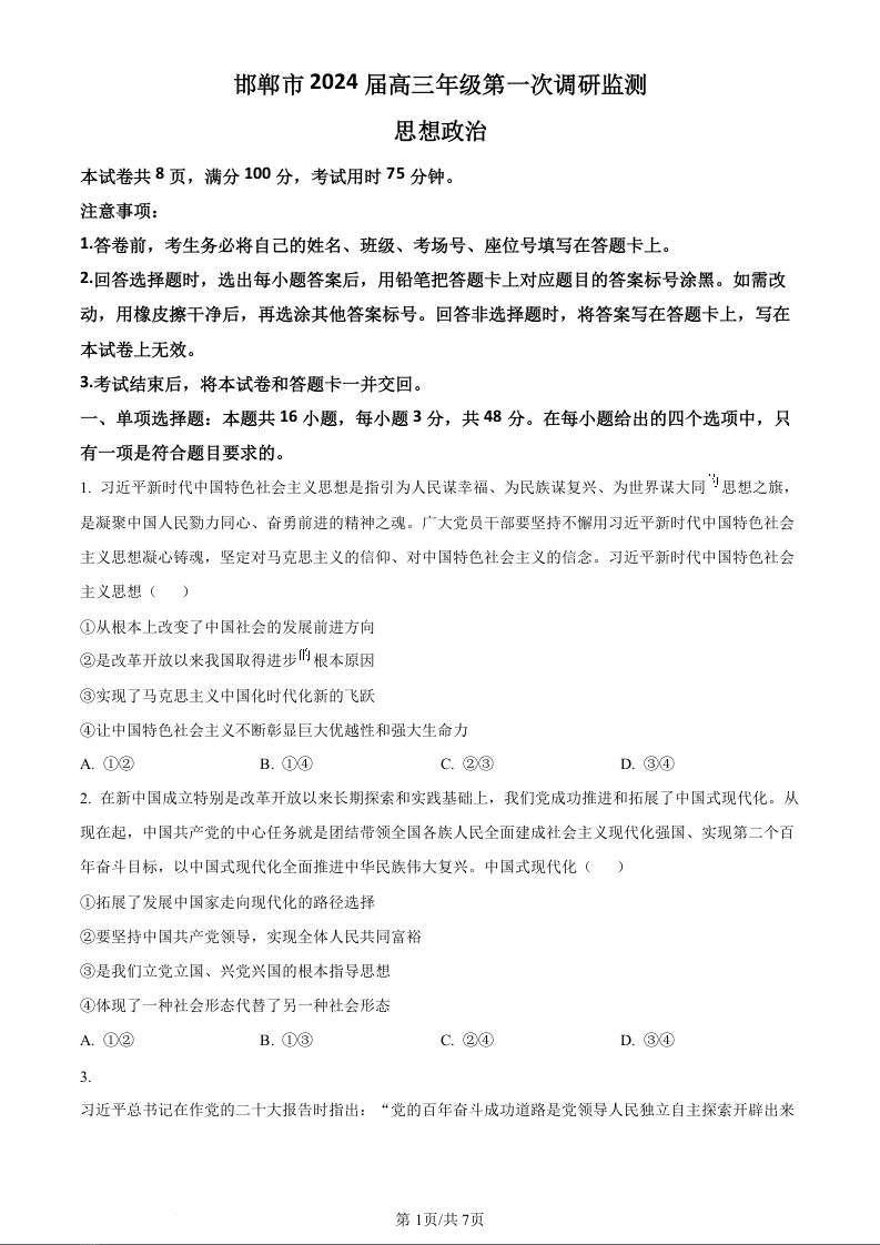 河北省邯郸市2024届高三上学期第一次调研监测政治(原卷版)