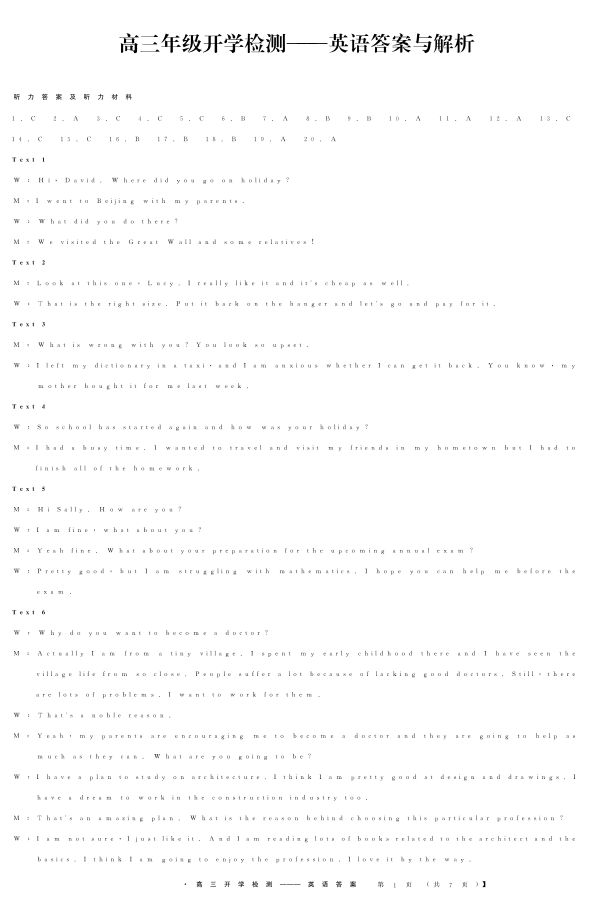 河北省秦皇岛市2024届高三年级开学检测英语答案
