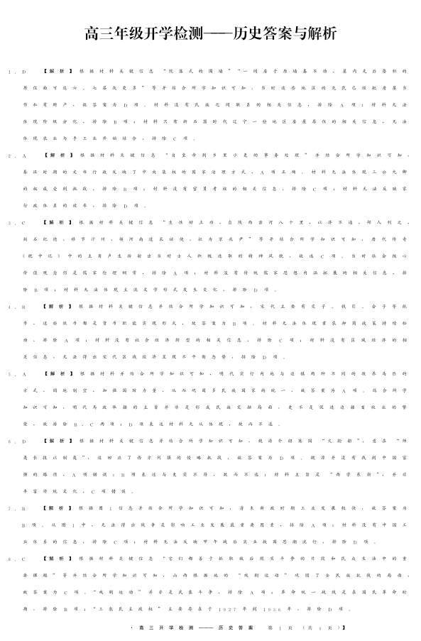 河北省秦皇岛市2024届高三年级开学检测历史答案