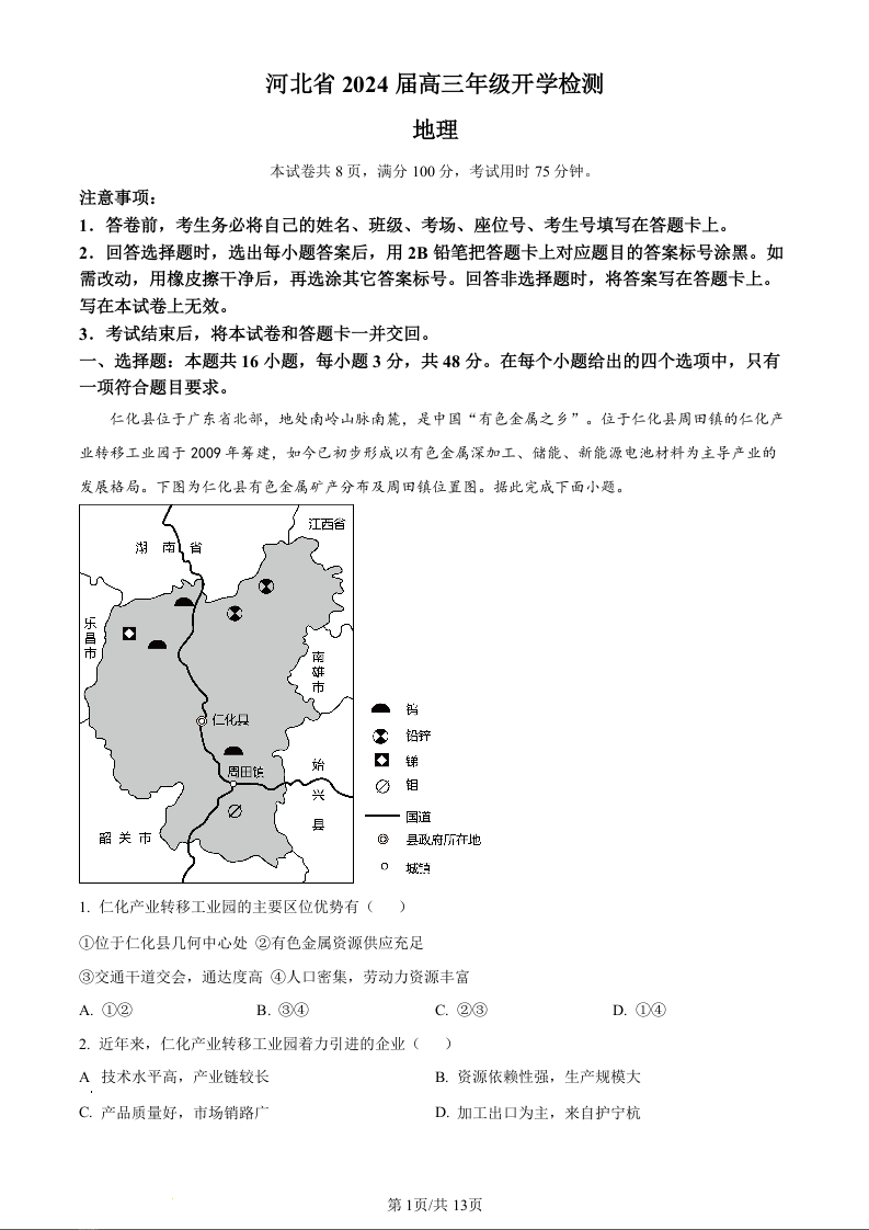河北省秦皇岛市2024届高三年级开学检测地理(精品解析版)