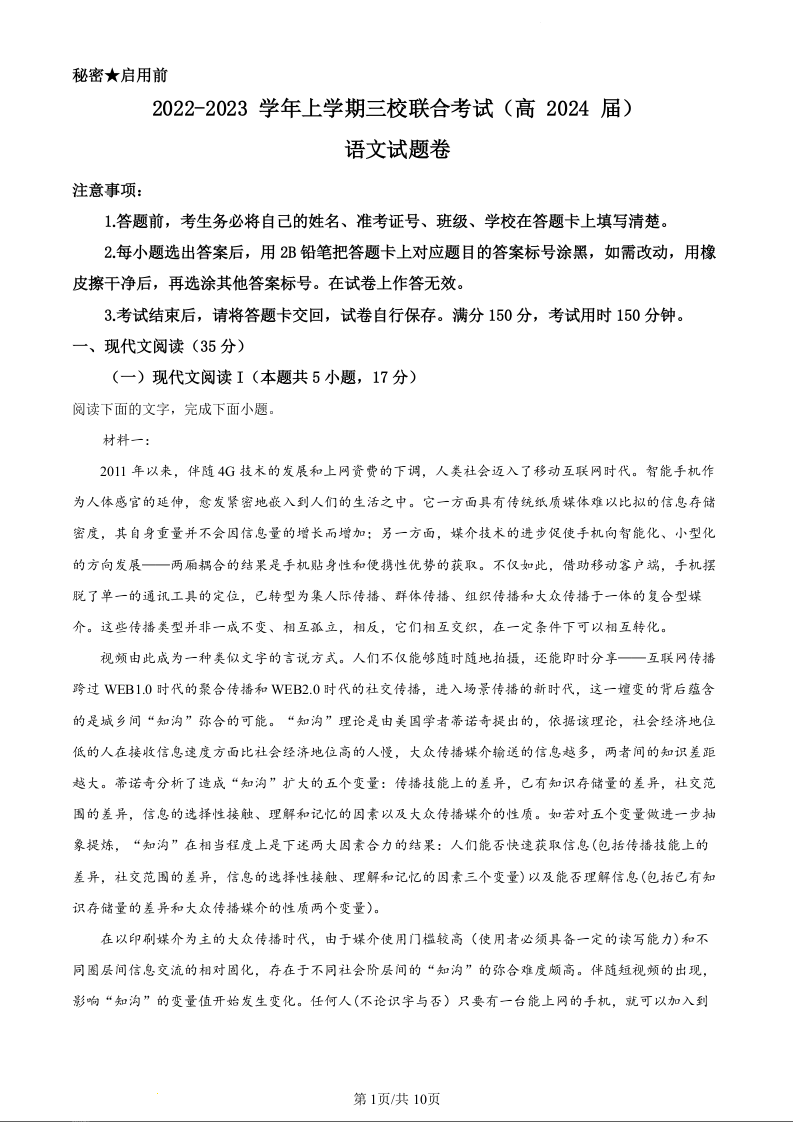 重庆市铜梁一中等三校2024届高三上学期10月联考语文(原卷版)