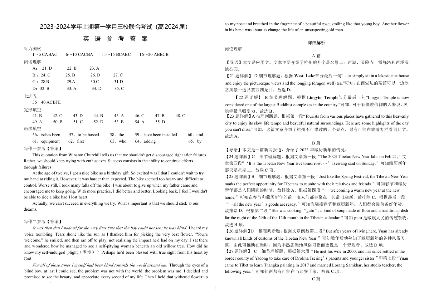 重庆市铜梁一中等三校2024届高三上学期10月联考英语答案