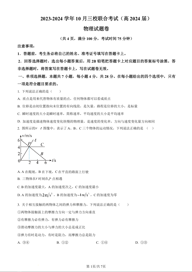 重庆市铜梁一中等三校2024届高三上学期10月联考物理(原卷版)