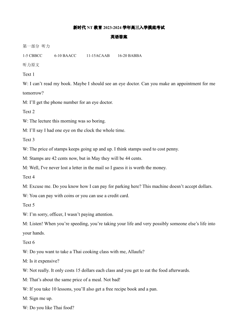 河北省新时代NT教育2024届高三入学摸底考试英语答案