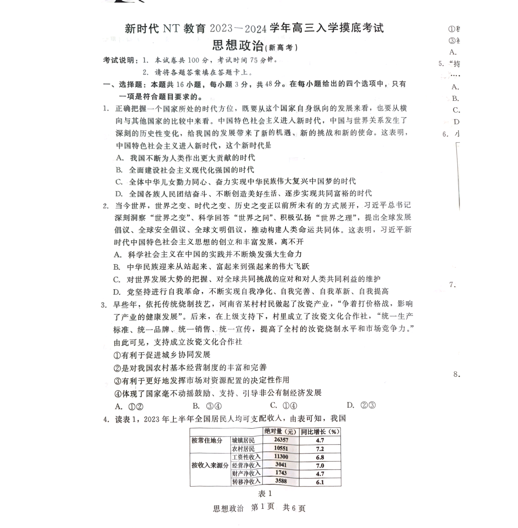 河北省新时代NT教育2024届高三入学摸底考试政治
