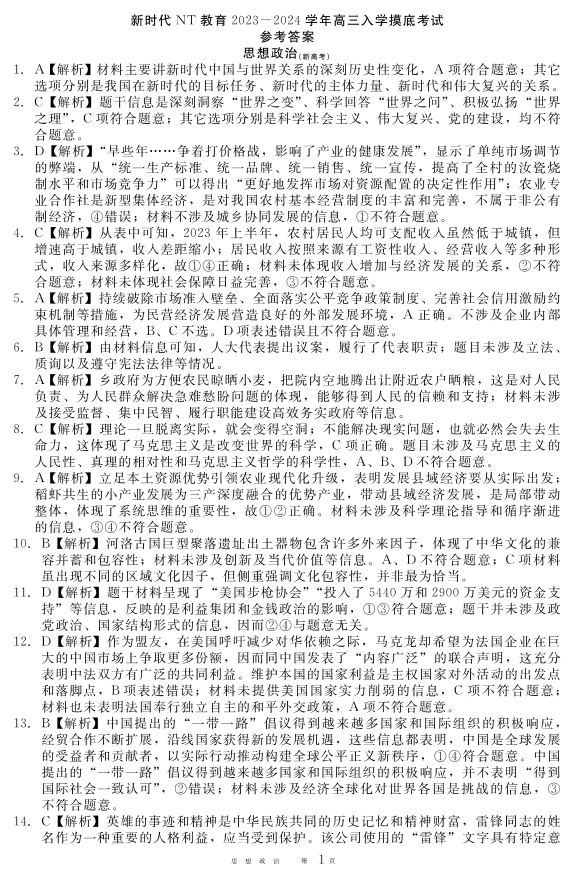 河北省新时代NT教育2024届高三入学摸底考试政治答案