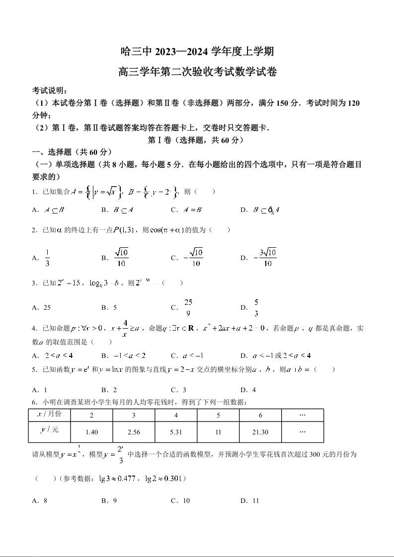 黑龙江哈尔滨第三中学2024届高三上学期第二次验收考试数学+答案