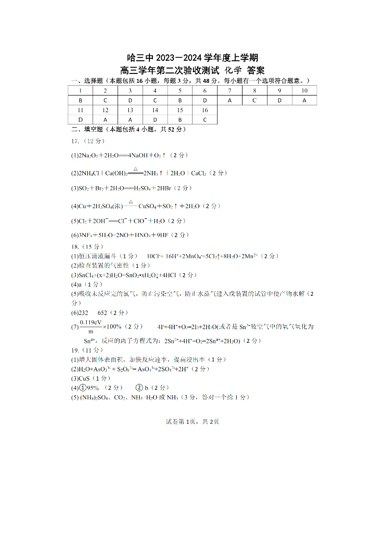 黑龙江哈尔滨第三中学2024届高三上学期第二次验收考试化学答案