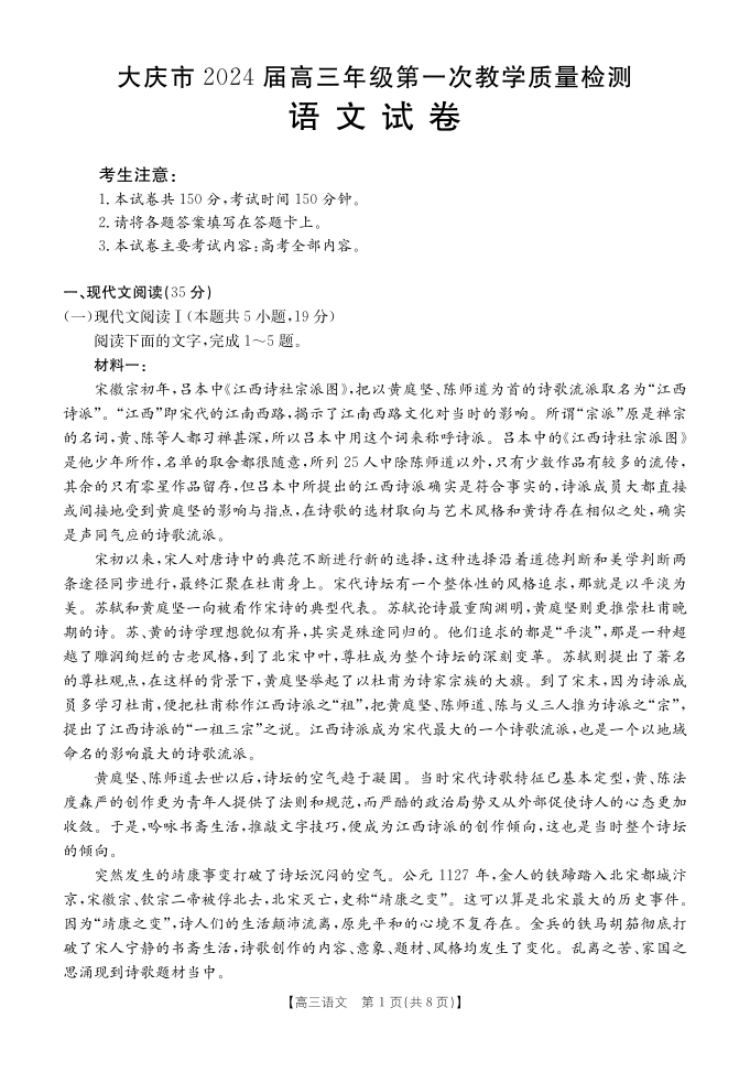 黑龙江省大庆市2024届高三上学期第一次教学质量检测语文