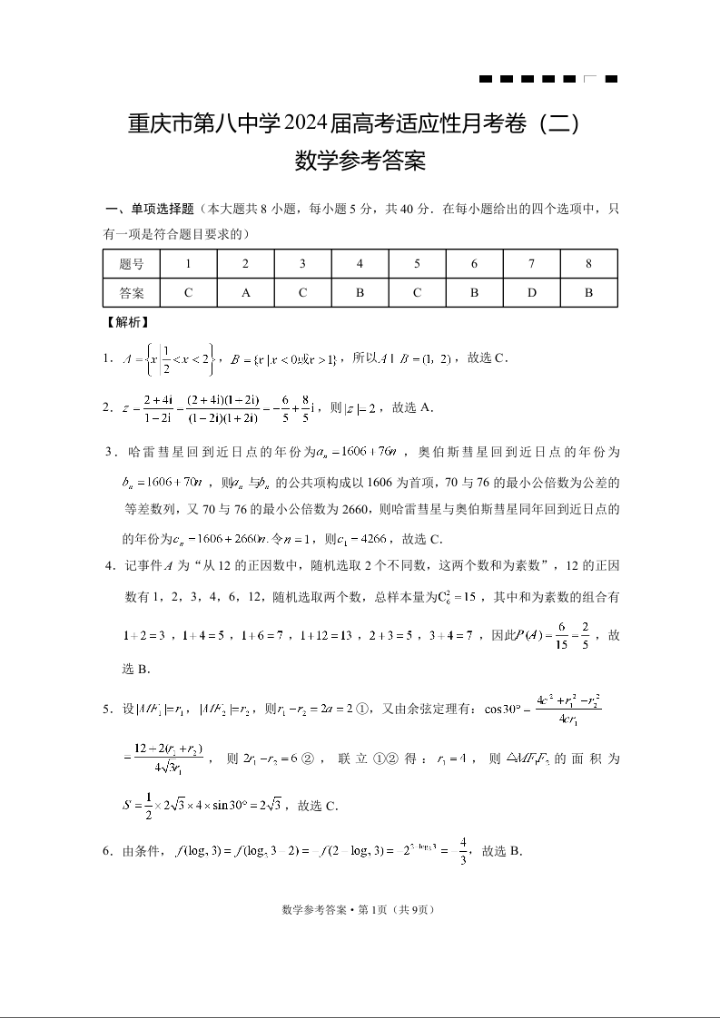 重庆市第八中学2024届高考适应性月考卷(二)数学答案