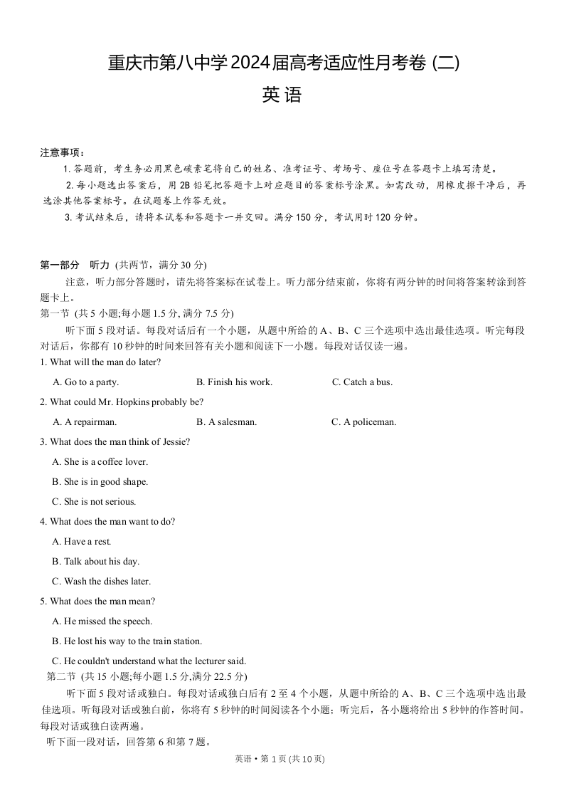 重庆市第八中学2024届高考适应性月考卷(二)英语