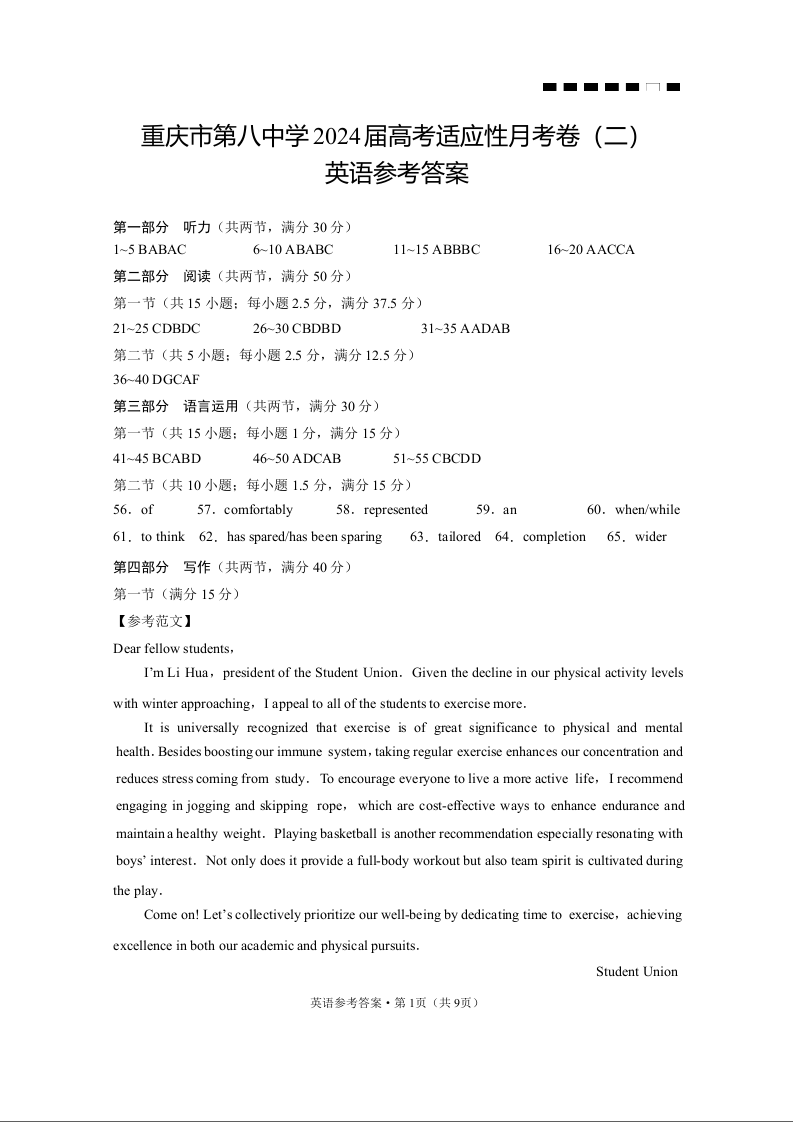重庆市第八中学2024届高考适应性月考卷(二)英语答案
