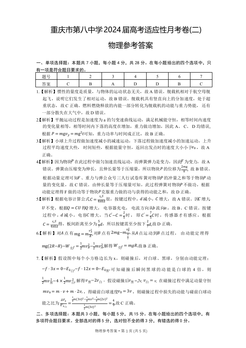 重庆市第八中学2024届高考适应性月考卷(二)物理答案