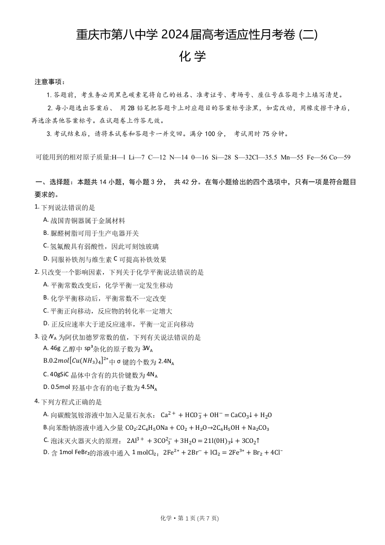 重庆市第八中学2024届高考适应性月考卷(二)化学